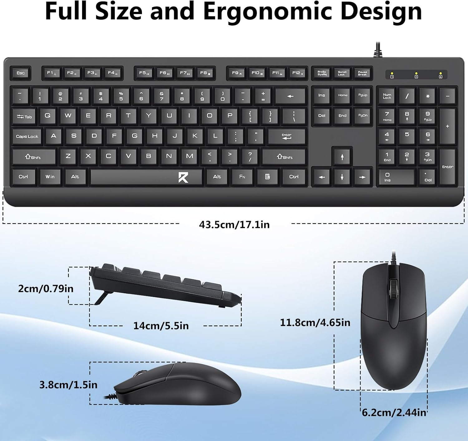La disposition du clavier pleine taille comprend un pavé numérique, des touches multimédia et un espacement confortable entre les touches. La souris fournie est conçue pour un suivi précis et un mouvement fluide du curseur sur diverses surfaces.