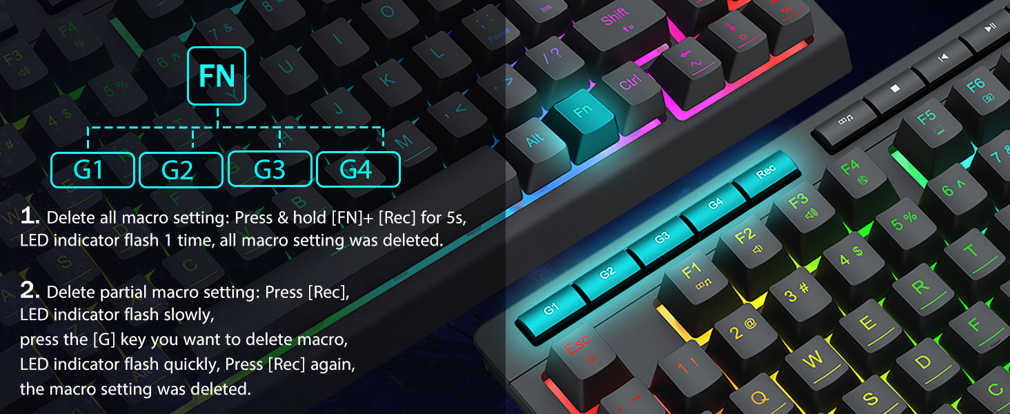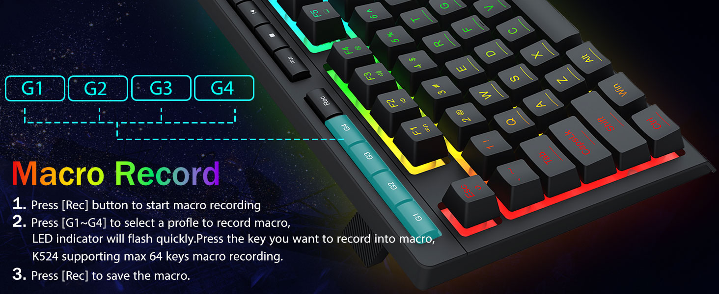 4 touches macro intégrées -4 touches macro intégrées (G1 ~ G4) sont programmables et fonctionnent à la volée sans aucun logiciel supplémentaire. Les touches sont faciles à modifier et peuvent exécuter une variété de macros différentes.