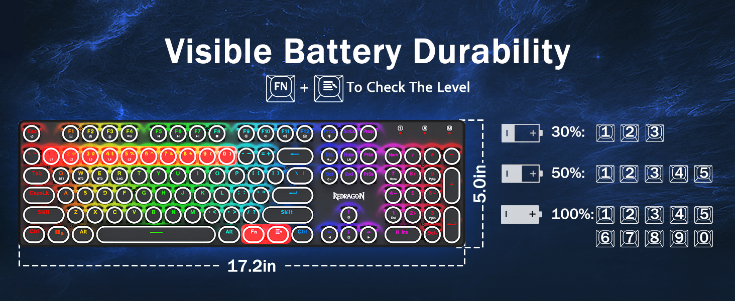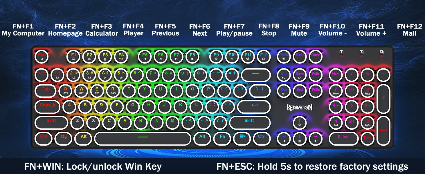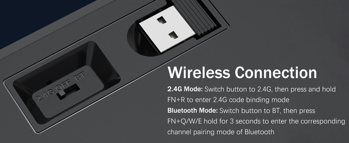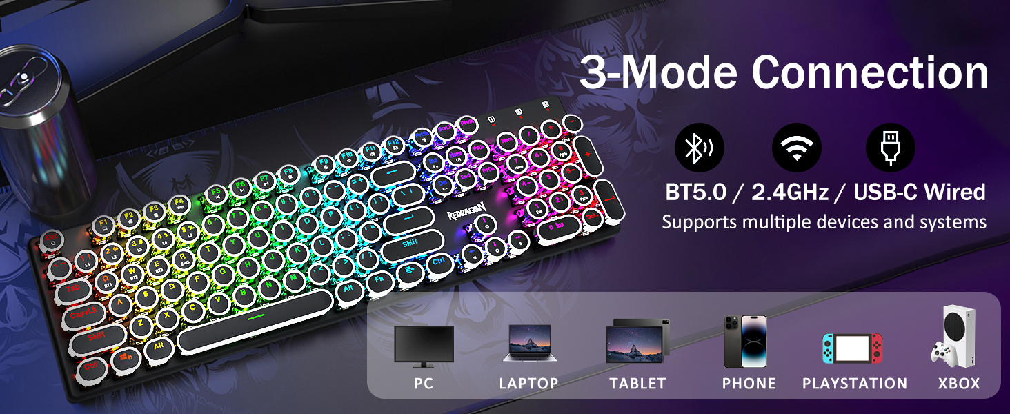 𝟯-𝗠𝗼𝗱𝗲 𝗖𝗼𝗻𝗻𝗲𝗰𝘁𝗶𝗼𝗻 -Équipé de la technologie de connexion tri-mode innovante Redragon, des modes filaire USB-C, Bluetooth 5.0/3.0 et 2,4 GHz qui permettent à l'expérience utilisateur d'être améliorée à un autre niveau dans tous les domaines. Appuyez sur FN+Q/W/E pour passer en mode Bluetooth, appuyez sur FN+R pour passer en mode 2,4G.