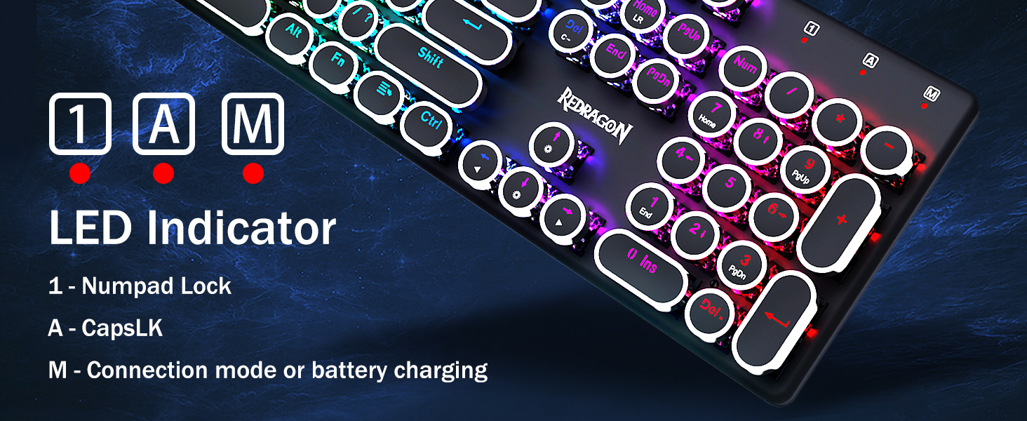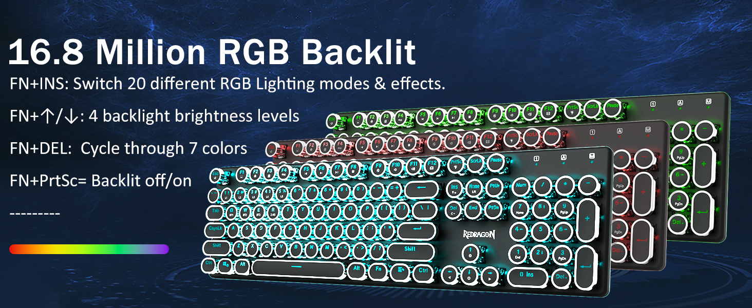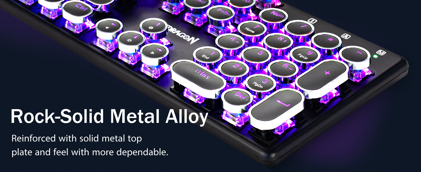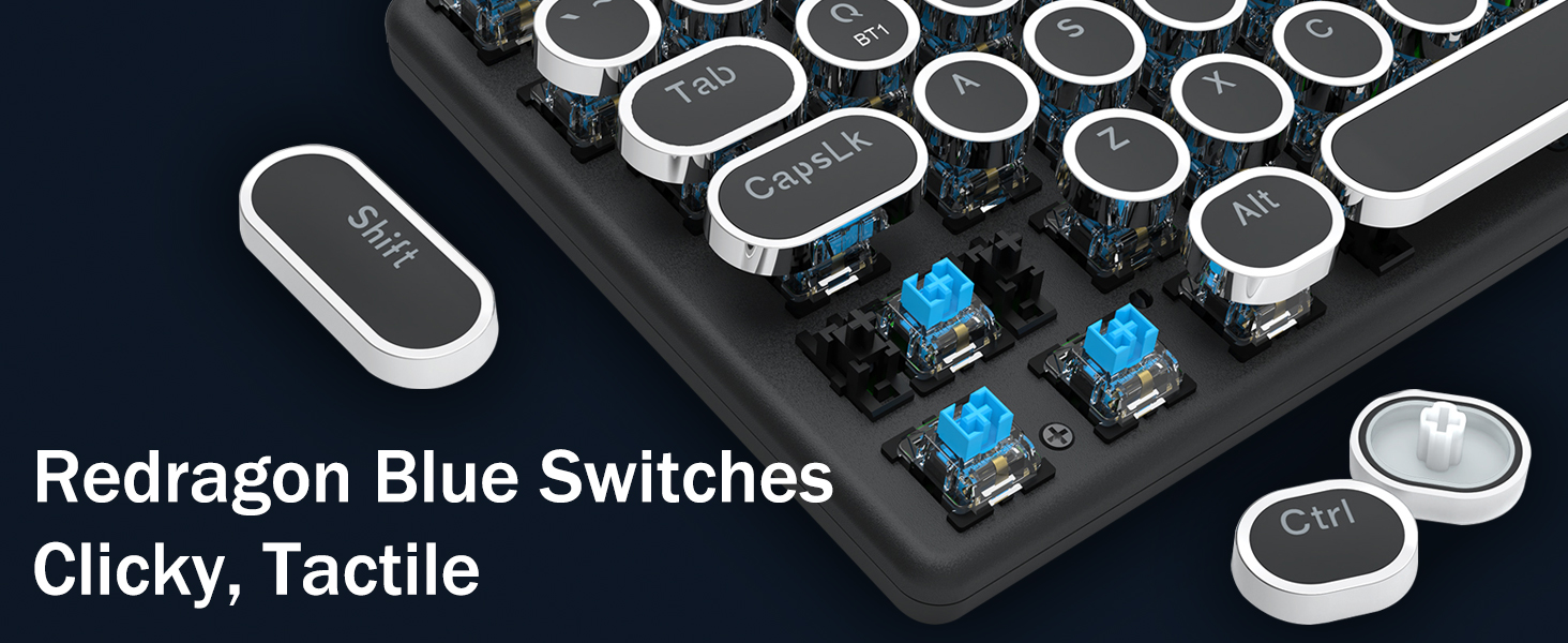 𝗥𝗲𝘁𝗿𝗼 𝗧𝘆𝗽𝗲𝘄𝗿𝗶𝘁𝗲𝗿 𝗦𝘁𝘆𝗹𝗲 𝘄𝗶𝘁𝗵 𝗠𝗲𝗰𝗵𝗮𝗻𝗶𝗰𝗮𝗹 𝗞𝗲𝘆𝘀 -Les commutateurs bleus mécaniques Redragon offrent une résistance moyenne, un son de clic audible et un retour tactile, offrent un environnement et des performances de jeu réactifs et précis. Les touches rondes du clavier steampunk vintage ressemblent à une machine à écrire classique, vous apportent une sensation de frappe confortable et un toucher de clic stable.