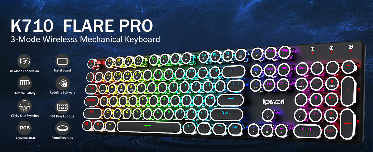 𝗗𝗲𝗽𝗲𝗻𝗱𝗮𝗯𝗹𝗲 𝗠𝗲𝘁𝗮𝗹 𝗣𝗮𝗻𝗲𝗹 & 𝟭𝟬𝟰 𝗞𝗲𝘆𝘀 𝗔𝗻𝘁𝗶 𝗚𝗵𝗼𝘀𝘁𝗶𝗻𝗴 -La version améliorée FLARE PRO continue d'utiliser le même matériau métallique solide. Gardez le clavier stable et élégant sur le bureau, pour une expérience de frappe haut de gamme. Le clavier K710 prend en charge la technologie anti-ghosting à 104 touches, permettant d'appuyer sur plusieurs touches en même temps sans conflit.