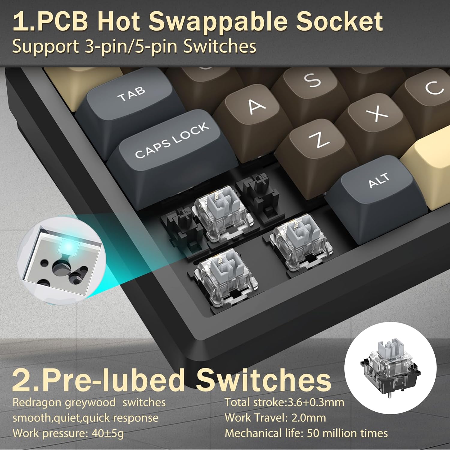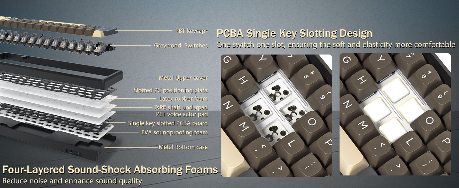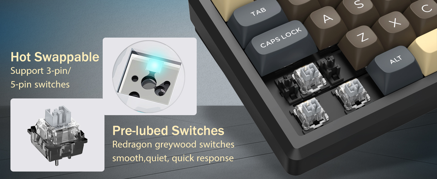 Équipé de commutateurs mécaniques, le clavier offre un actionnement et un retour tactile cohérents. Cela prend en charge une saisie précise et une saisie fiable pour les tâches de jeu et de travail.