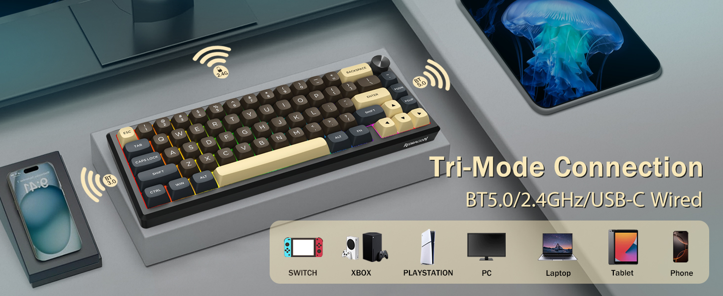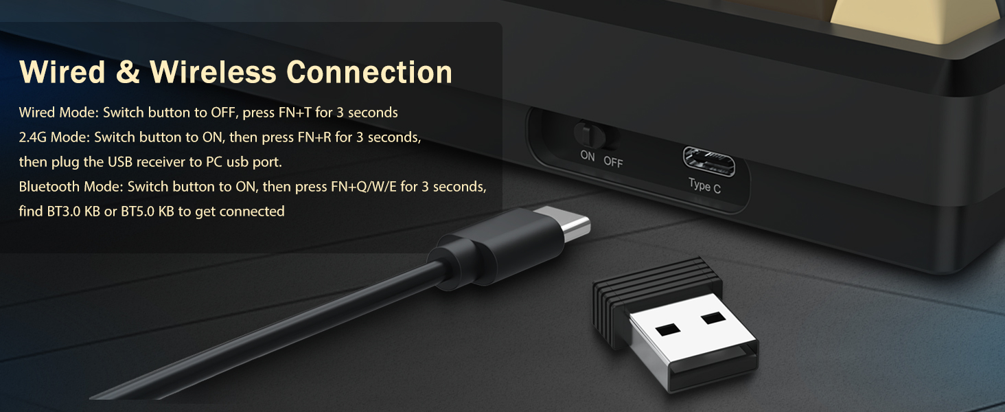 Le clavier prend en charge la connectivité sans fil pour plus de commodité et une connexion USB filaire pour des performances stables. Les utilisateurs peuvent basculer entre les modes en fonction de leur configuration.