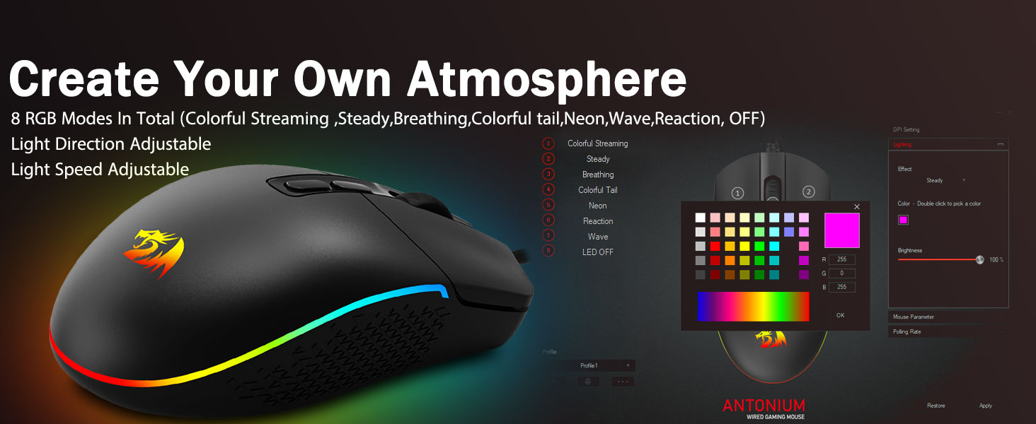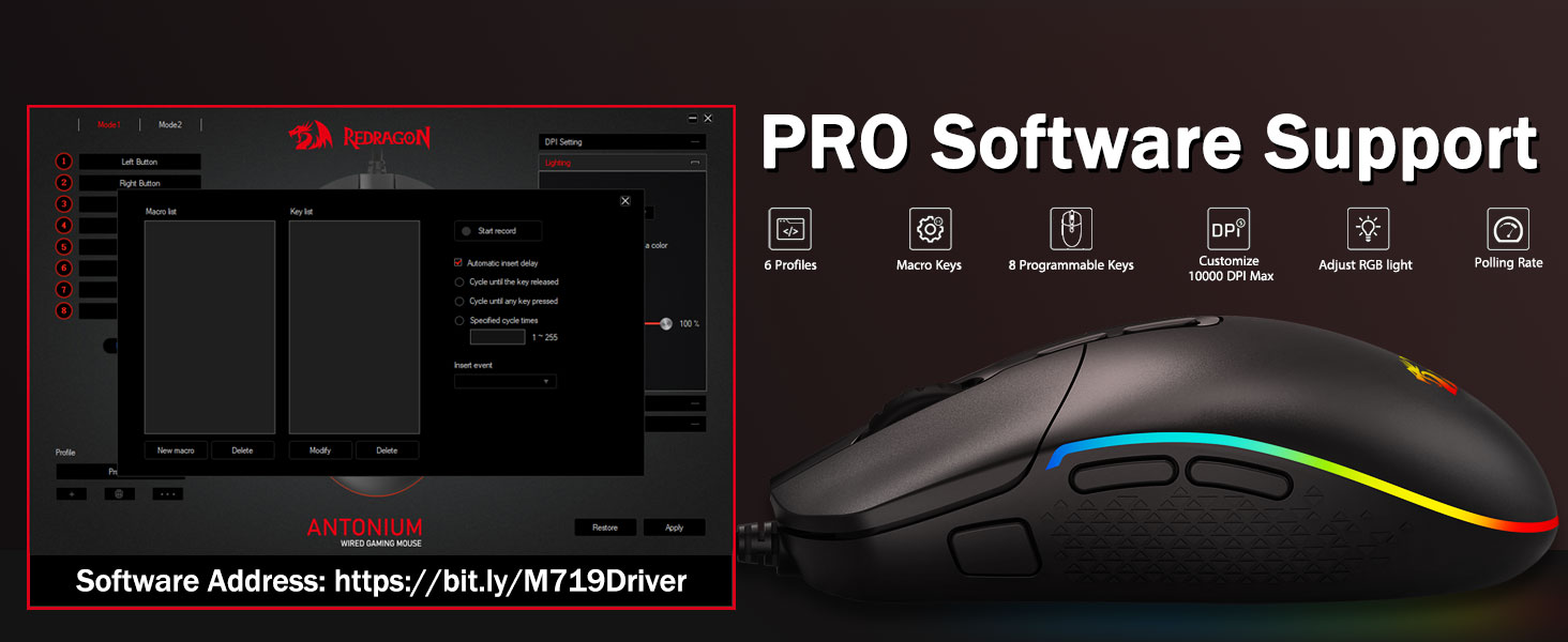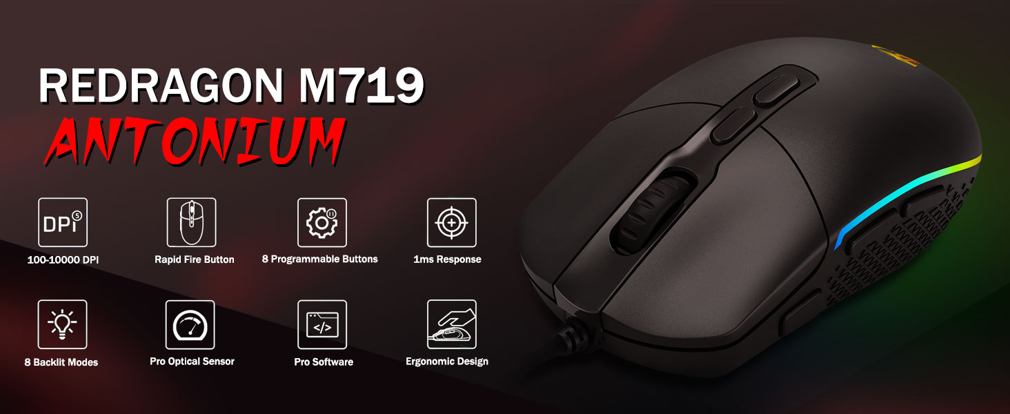 Lien logiciel : bit.ly/M719RGBDriver- Allumez le rétroéclairage et faites quelques victimes sur votre champ de bataille de jeu. L'ambiance dynamique rétroéclairée RVB ne vous laissera jamais tomber lors de la décoration de votre espace de jeu, ce serait mieux avec d'autres accessoires Redragon avec des lumières allumées.