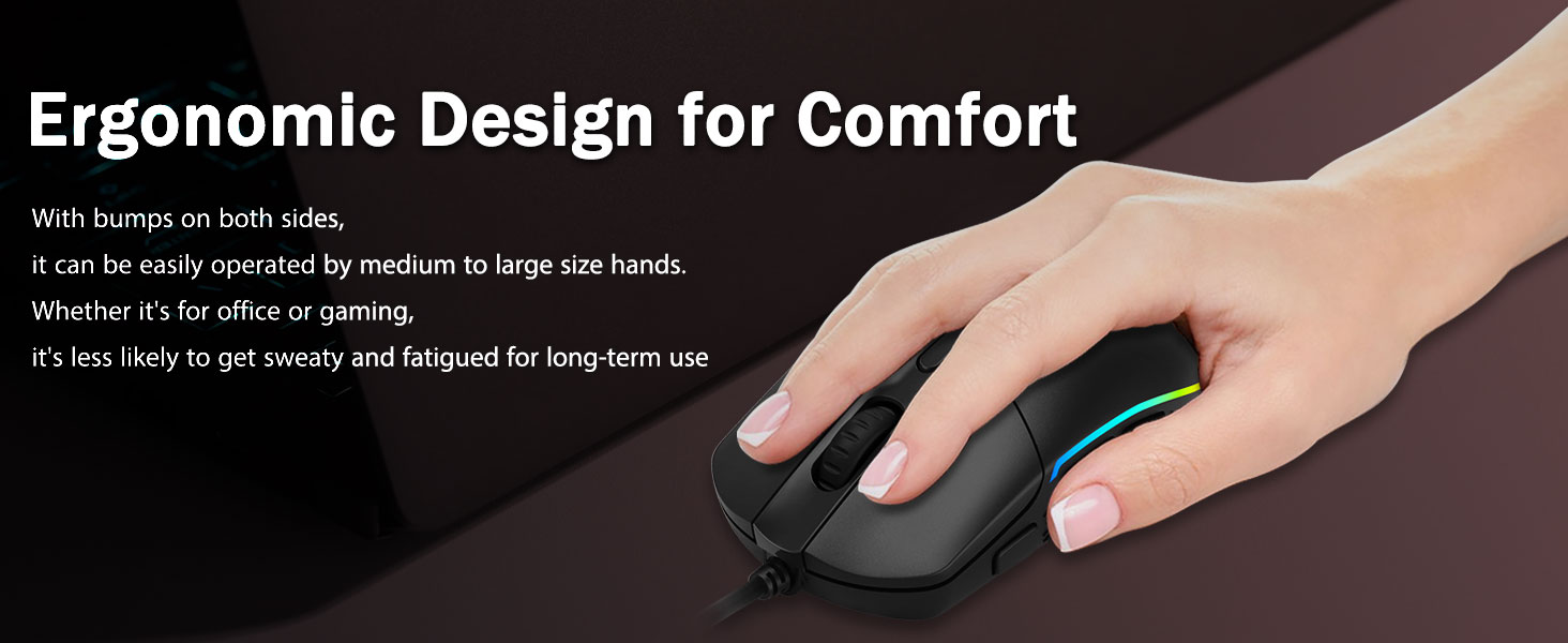 Prise confortable- Les bosses ergonomiques des deux côtés permettent aux souris de jeu de tenir dans toutes les mains. Il offre un confort durable aux joueurs, sans fatigue même pendant de longues heures de jeu intense. Elle ne glissera pas lorsque vous soulevez la souris de jeu ou effectuez des balayages rapides et précis.