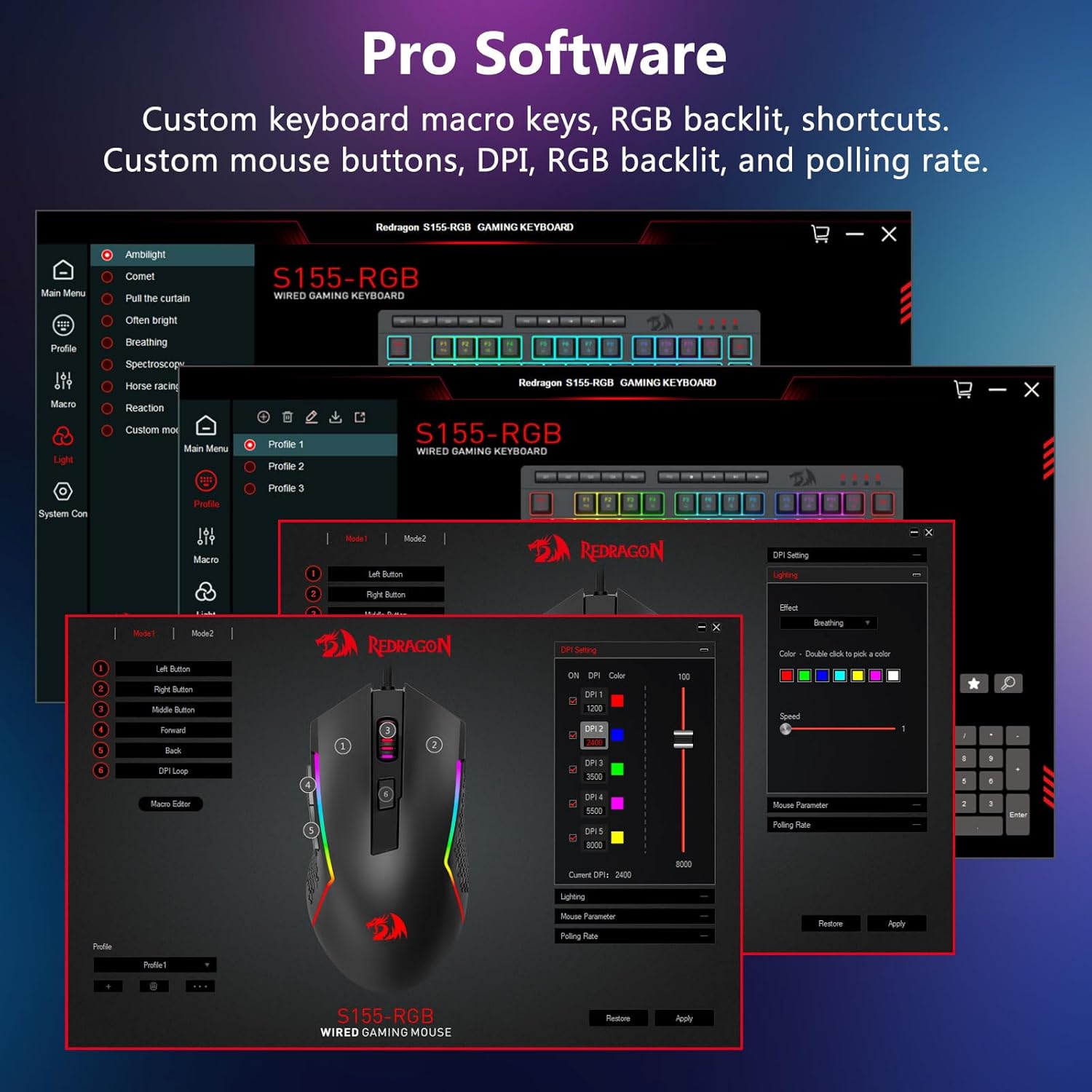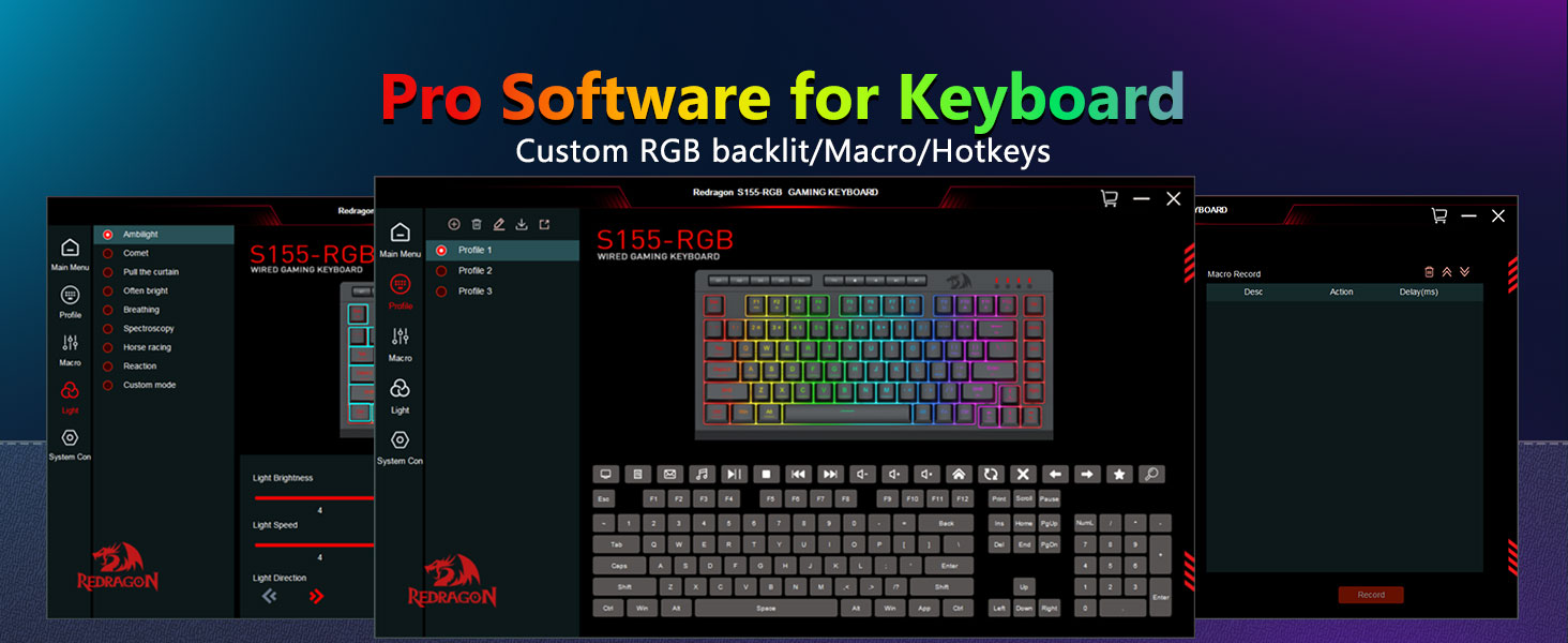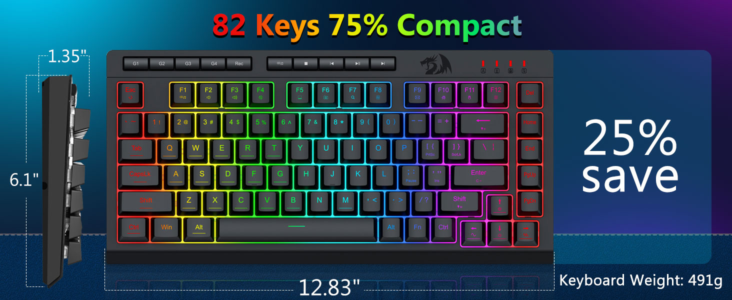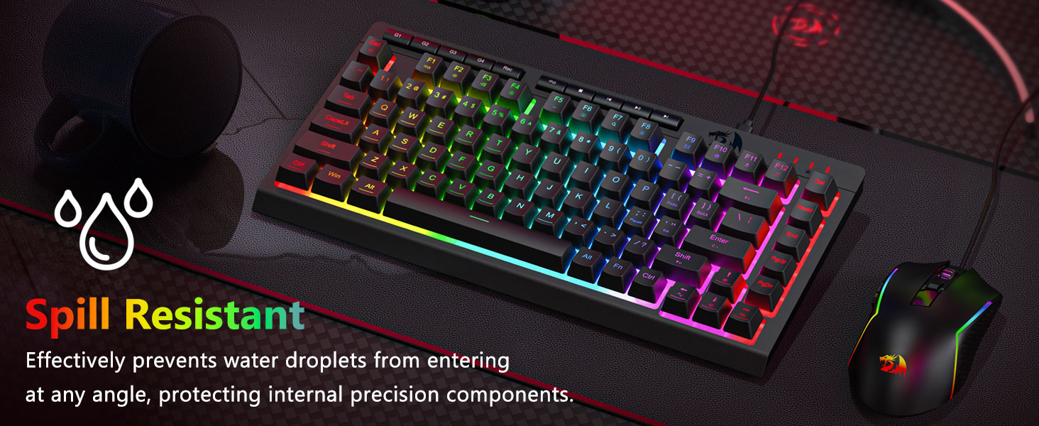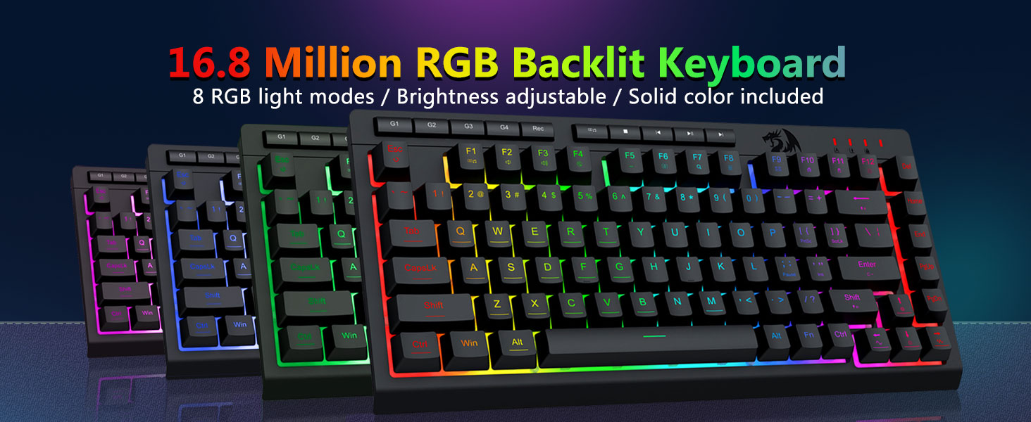 【Clavier et souris de jeu RVB】Le clavier de jeu dispose de 8 modes d'éclairage RVB parmi lesquels choisir et la souris de jeu dispose de 8 effets d'éclairage entre lesquels basculer, et le clavier peut être réglé sur 4 niveaux de vitesse et de luminosité selon vos préférences. Les touches offrent un rétroéclairage clair et uniforme. Que l'ensemble soit constitué d'une seule lumière, d'effets de lumière changeants ou pas de lumière du tout, le clavier et la souris gaming Redragon répondront à vos besoins !