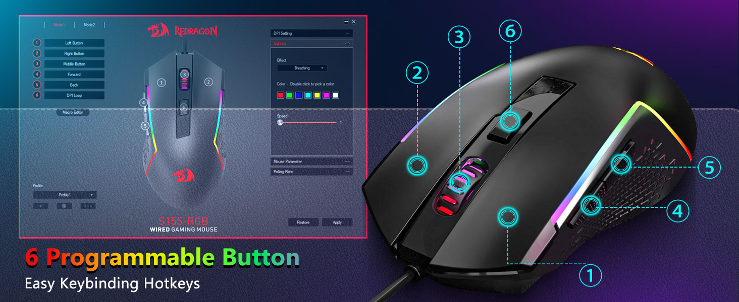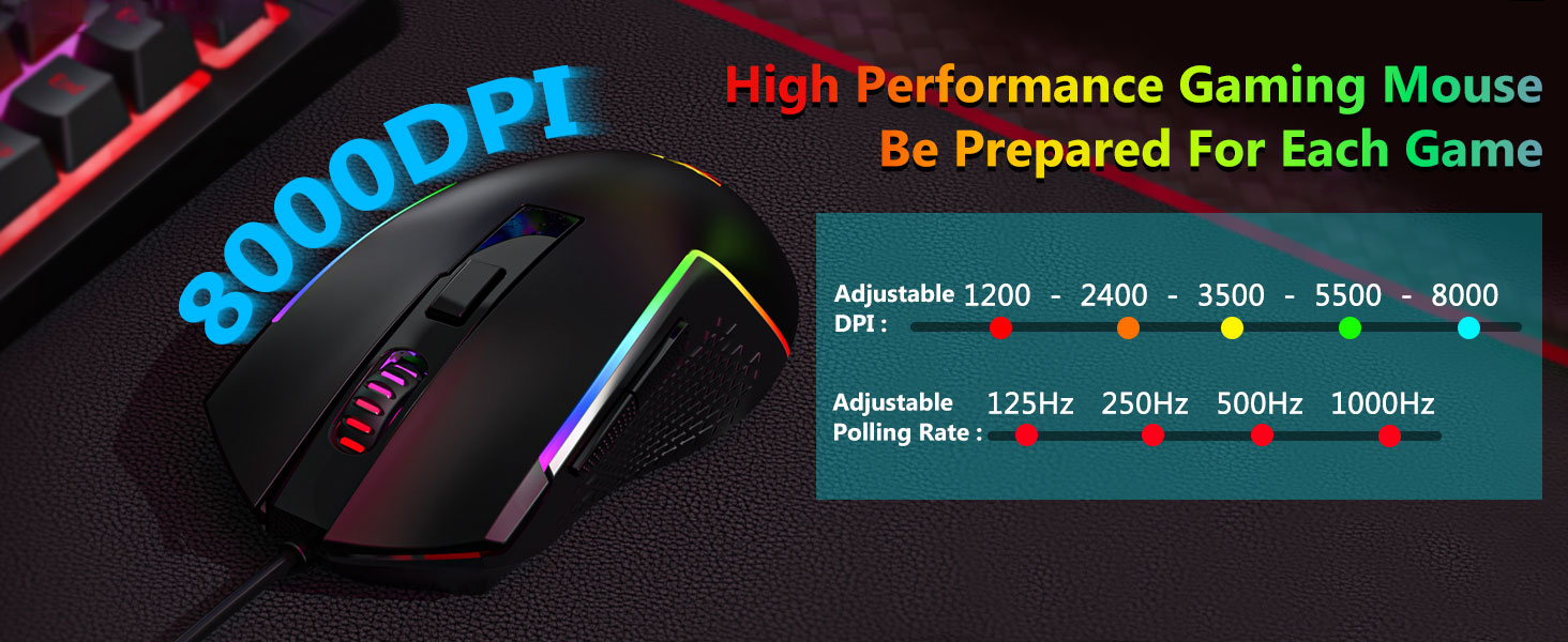 【Souris de jeu professionnelle】Vous pouvez régler le DPI de 1200 à 8000 via le bouton DPI ou de 100 à 8000 via le pilote logiciel pour répondre facilement à vos différents besoins en jeu ou au travail. Total 7 boutons dont 6 programmables. Le capteur de haute précision offre une précision extrême tandis que les micro-commutateurs de qualité jeu garantissent une longévité, une plus grande durabilité et une réactivité extrême, vous donnant un avantage encore plus grand sur vos concurrents. (Le logiciel prend également en charge le réglage du taux d'interrogation de la souris jusqu'à 1 000 Hz)